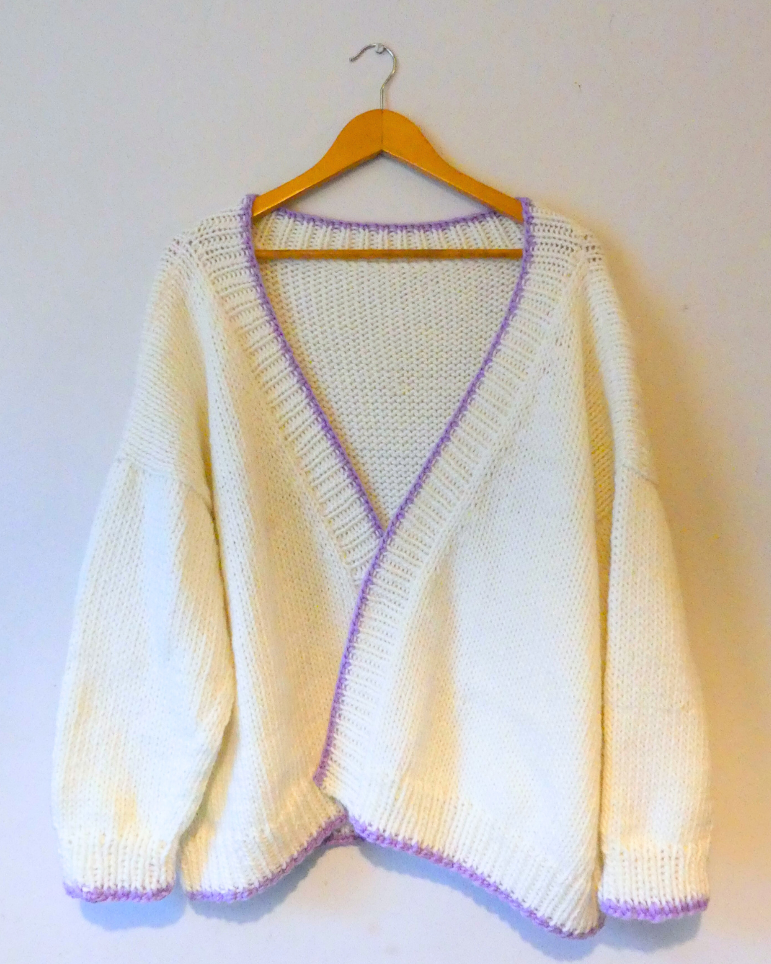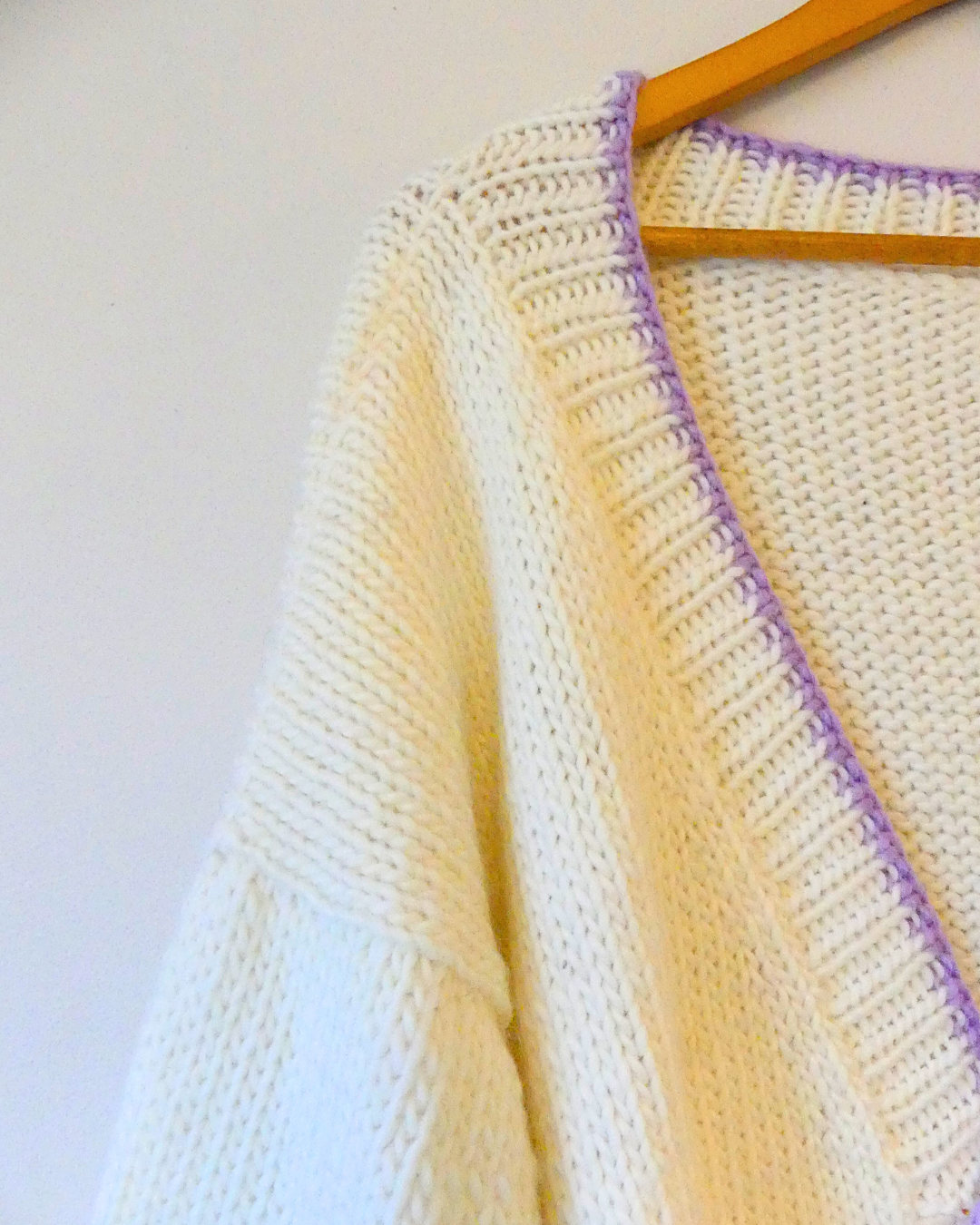 The Marshmallow Cardigan is a seamless, bulk weight cardigan suitable for confident beginner knitters. You’ll start by knitting the back panel until the point where the panel would reach your underarm when you’ll put these stitches on hold. You’ll then pick up the stitches for the 2 front panels and join these. You’ll then knit the front and back panels together. You’ll then pick the stitches up for and knit both sleeves. Stitches are then picked up for the front ribbing which is knitted in 1x1 rib. The cardigan is designed to be worn open but buttons can easily be added.