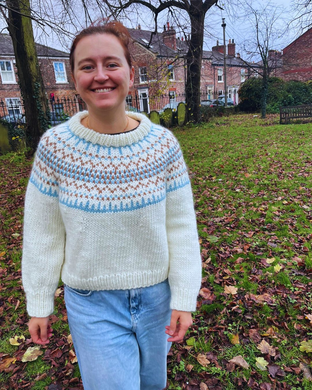 The Snowdrop Sweater is a top-down circular yoke sweater with simple colour work. You’ll start by knitting a double folded collar before knitting the colour work. You’ll then separate for sleeves and work the body. The stitches for the arms are then picked up and knitted with tapered decreases.